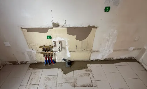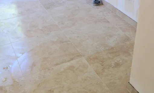 Rénovation de cuisine avec collecteur et carrelage imitation travertin sur Bastia